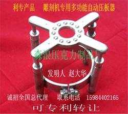 多功能自动压板器,不需夹子,只需小量双面胶带和纸胶带,节约双面胶带及纸胶带60%以上,节约人力95%以上。操作人员无伤亡现象存在,雕刻出的产品合格率(除人为而外)可达到100%,雕刻尺寸准确,具有消音防尘等功能,不影响换刀,压板器弹力自动伸缩范围2公分左右,无疑是国内外一种低投入高回报无可代替的新型产品。