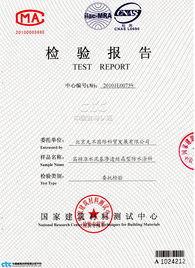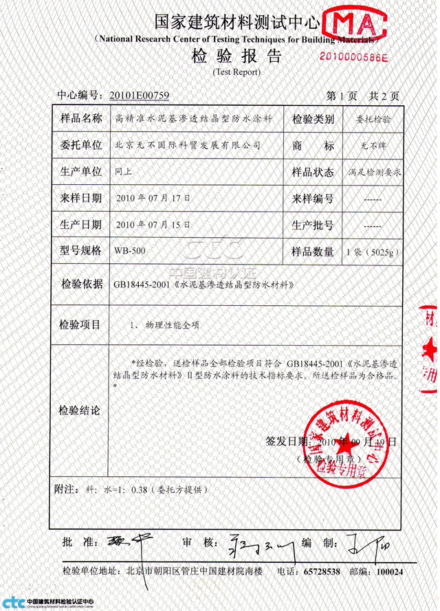 本网消息:据来自国家建材检测中心检测消息,北京无不国际科贸发展公司随机送检的国家商标“无不”牌WB-500Ⅱ型规格防水材料,达到了国际防水材料的高精准的先进水平,这是我国防水材料技术跨入建筑防水用材国际市场的一个标志。