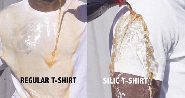 原来,这种T恤的材料以二氧化硅为主,其纤维上包含了数以万计的硅石微粒。液体类物质一旦碰到它,就会形成球状并滚落。也就是说,穿上这件衣服,你在食用可乐、番茄沙司、红酒这类食物时不用在小心翼翼的了。